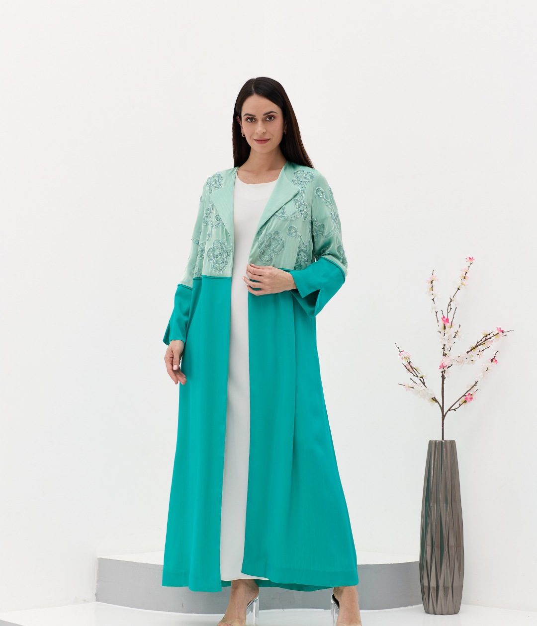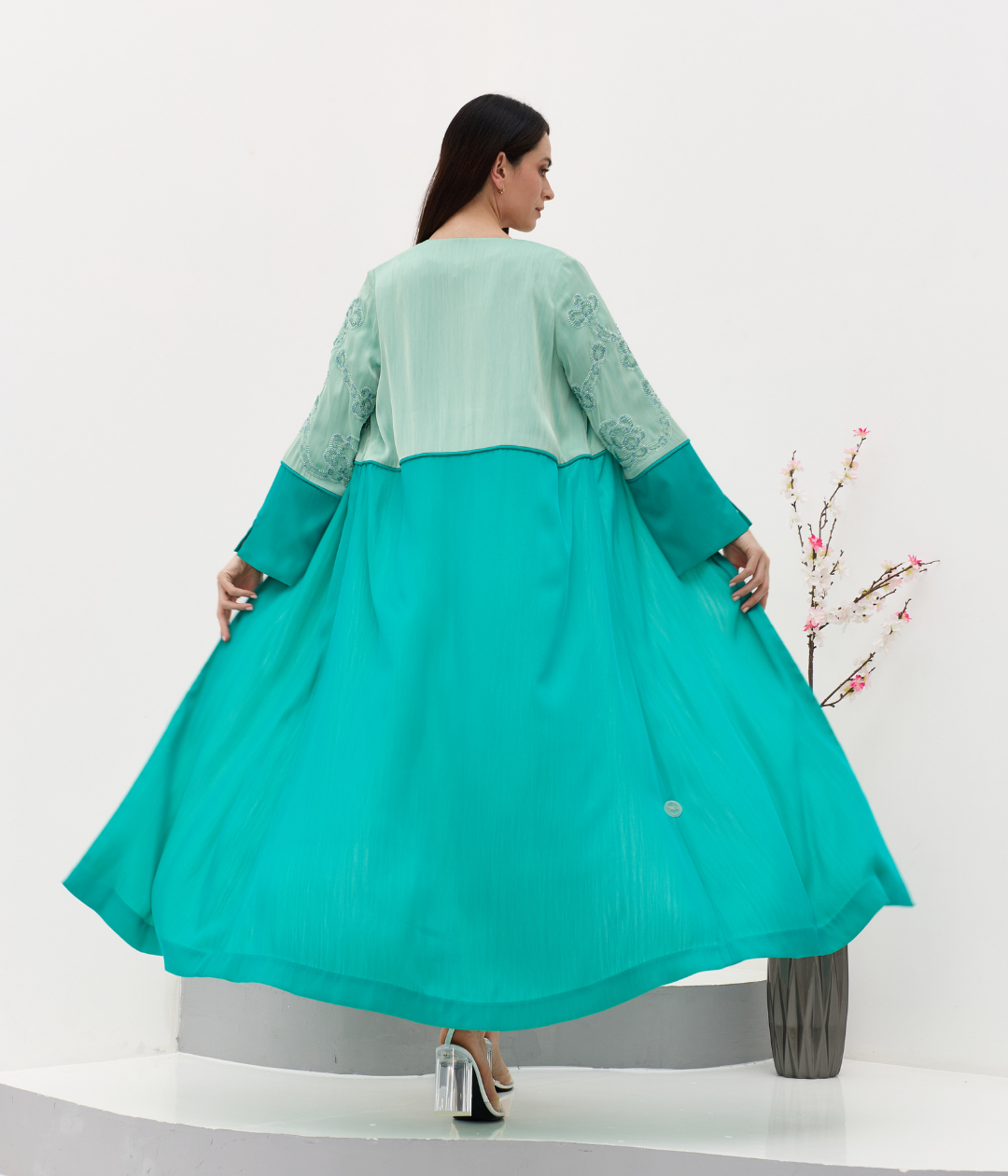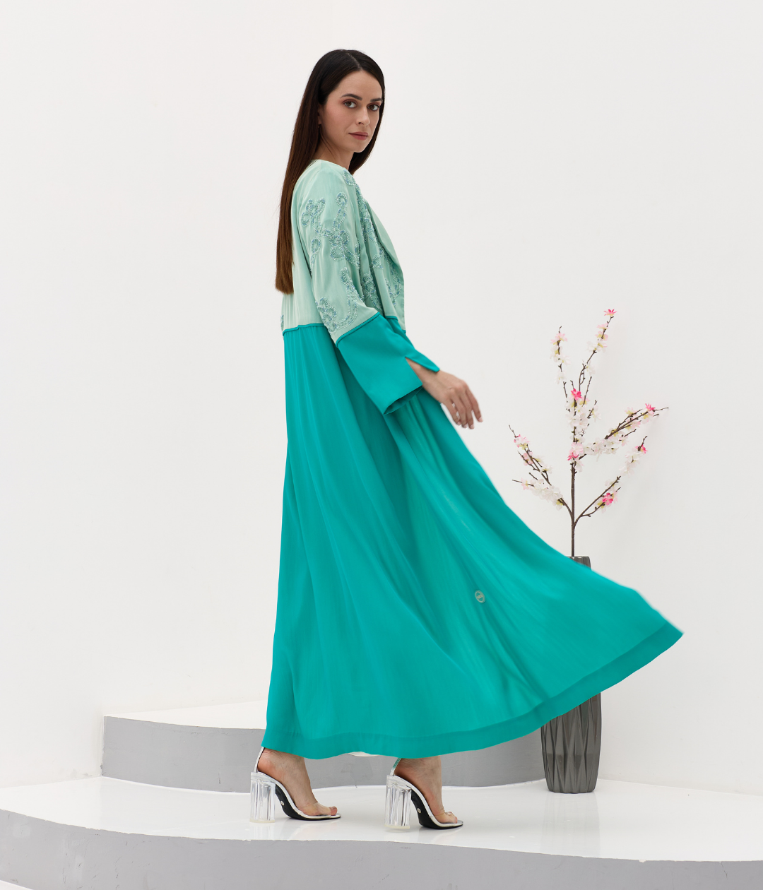 PRODUCT : ID 1143 CATEGORY: EMBROIDERED ABAYA FABRIC:CREPE COLOR: GREEN HEADSCARF: INCLUDED