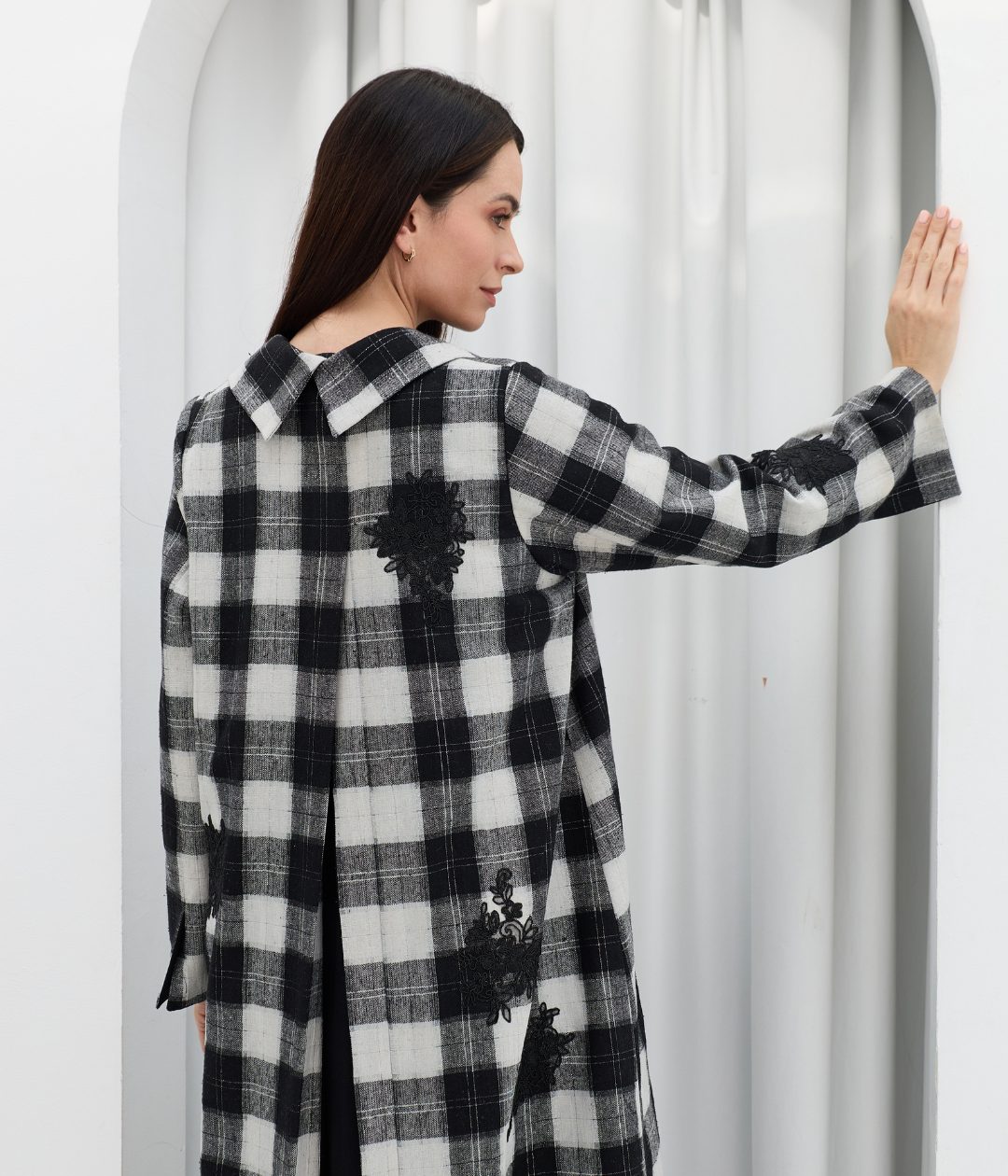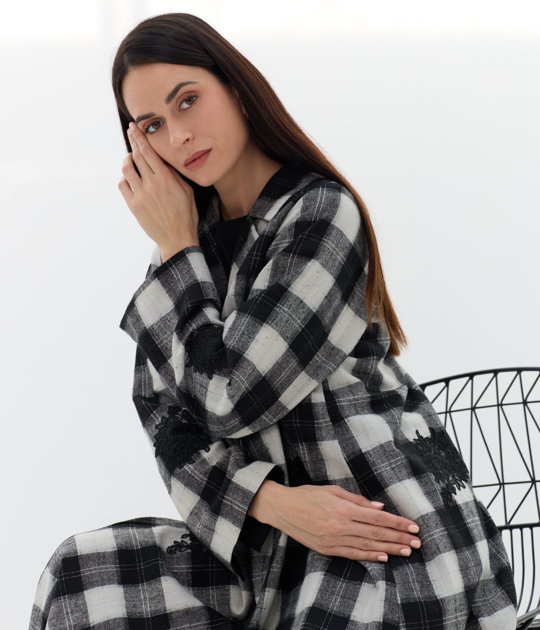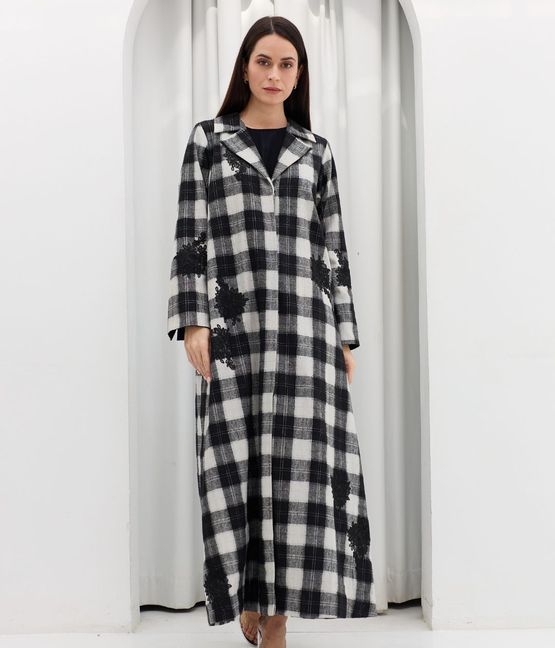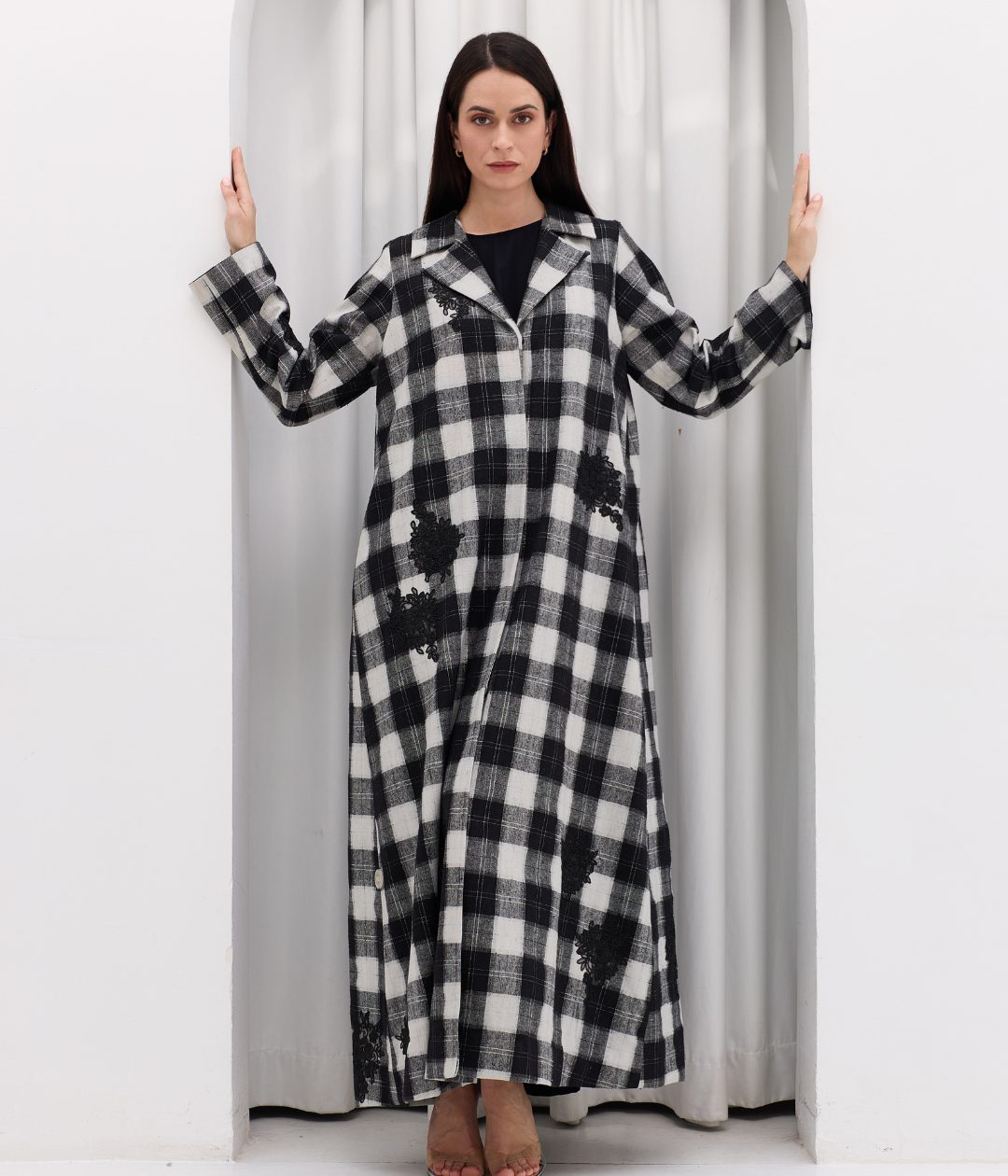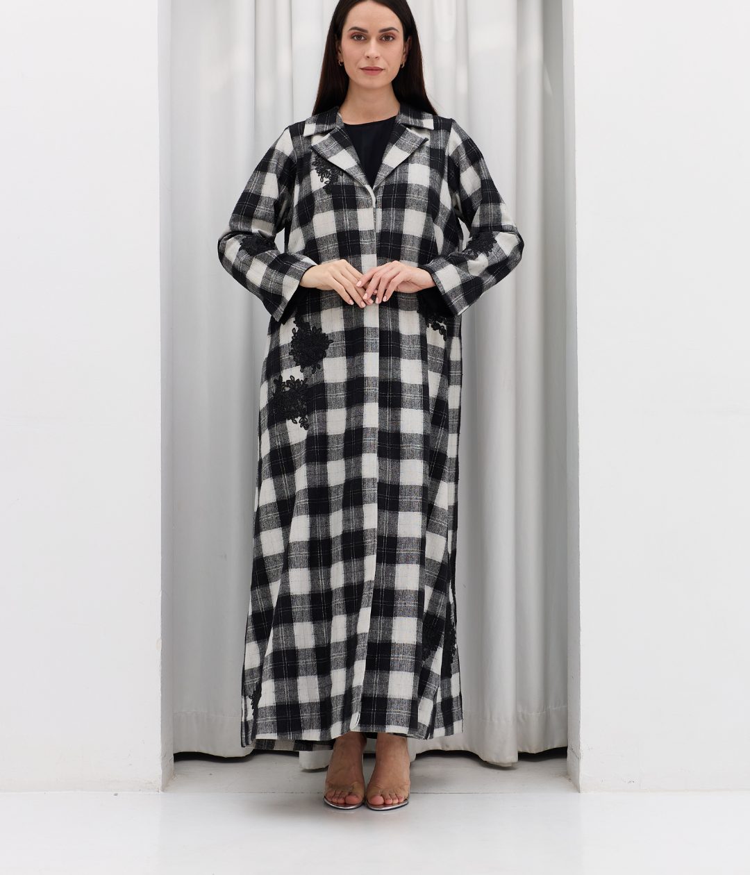 PRODUCT : ID 1184 CATEGORY : EMBROIDERED ABAYA COLOR : BLACK & WHITE FABRIC : SOFT LINEN HEADSCARF : INCLUDED